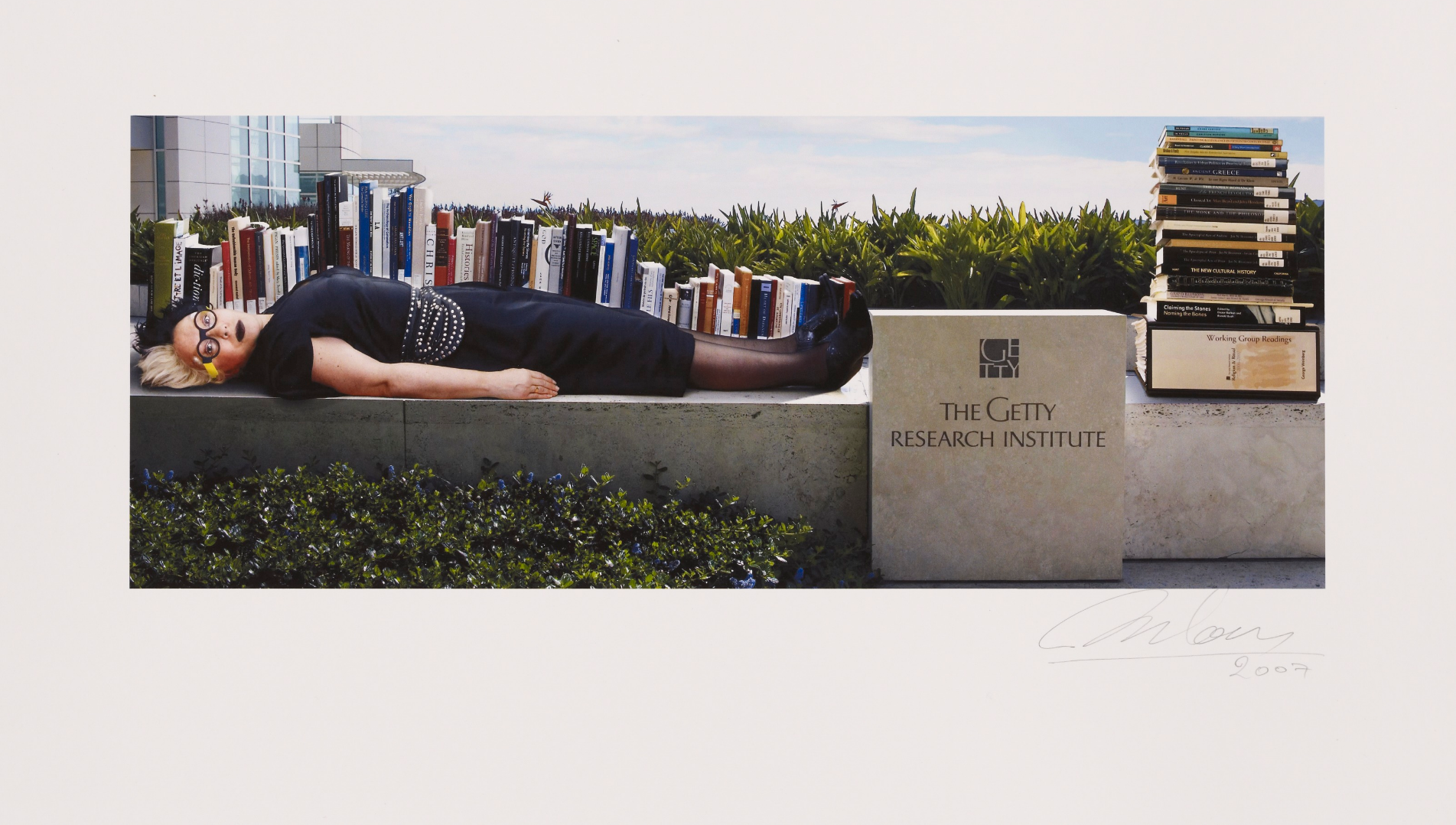 ORLAN's Untitled is a photograph of the artist lying on a stone wall next to the Getty Research Institute, with books stacked horizontally at her feet and vertically behind her.
