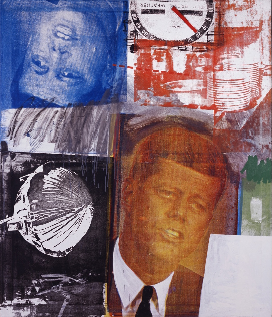 In 1962, Andy Warhol ushered in the next era of Rauschenberg’s career when he introduced Rauschenberg and his then secret lover Jasper Johns to the photo-silkscreen method, and we’re sure glad that he did. Made in 1963, this eerie, JFK-centric silkscreen painting marked a transition in Rauschenberg’s career and his growing interest in experimenting with the process, which he continued to do for the rest of his life. It turns out that JFK was a popular subject for art during this time – Elaine de Kooning painted the president’s portrait in 1962. I guess being “the leader of the free world” will do that for you. For Rauschenberg, the young president symbolized change and the prevailing sense of American progress. The ever-so-dashing JFK appears in many of his silkscreen paintings.