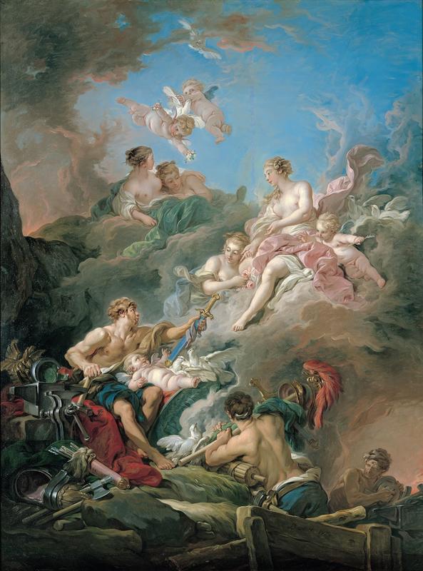 Venus at Vulcan’s Forge was one of six works painted for an hôtel in Paris. An hôtel is an urban mansion, not a Motel 6 hotel, though now it’s a school (French Revolution etc.) but you can still see the fancy carriage doors at 3 rue Béranger. Anyway, Boucher was strictly about pleasure. Ostensibly the scene is about Venus shopping for weapons for her not-god son Aeneas to use against the Trojans, but look at this painting, it’s dripping with millennial pink and hot almost-nudes and seems entirely unconcerned with war and any other unpleasant things. That baby in Vulcan’s lap means that Venus is in full control (mhm yeah she is), he’s handing his sword (“sword”) over to her like a rose but she’s more interested chilling in clouds with her girls. If you didn’t know the mythological reference you’d probably think this was some soft-erotica cosplay fanart.