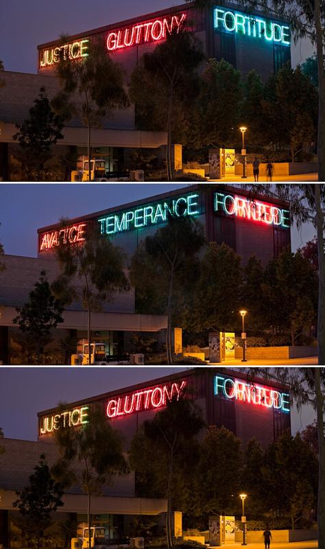 Around the perimeter of the top of the Powell Structural Systems Laboratory reads seven vices and seven virtues: lust, envy, sloth, pride, avarice, gluttony, anger, and faith, hope, charity, prudence, justice, temperance and fortitude, respectively. As the website states so eloquently, “Here, atop a laboratory where engineers erect and then stress parts of buildings to test their resistance to earthquakes, this cataclysmic list of moral opposites, created long ago, takes on special significance. The virtues flash sequentially clockwise around the building at one rate; and the vices circulate counterclockwise at a slightly faster rate. At brief intervals, both the seven virtues and the seven vices flash together.”