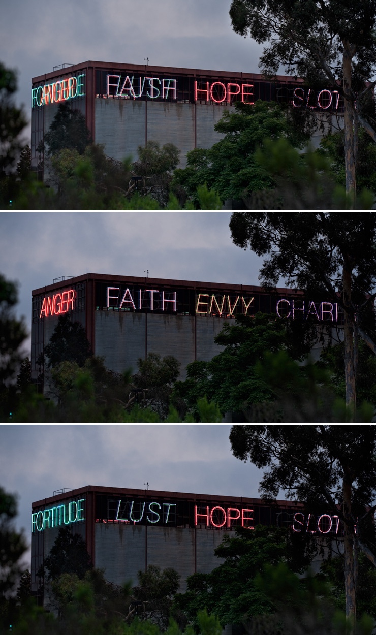 Vices and Virtues is pretty much exactly what it sounds like, written in really big, neon, flashing letters around the top of a building on the campus of UC San Diego.