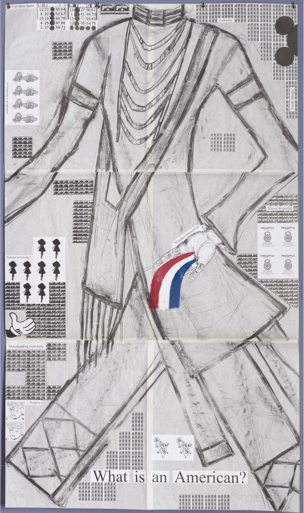 The closer you look at What is an American, the more you see. In the collaged background, there are all kinds of Easter eggs. There's mages of pineapples, a Mickey Mouse hand, Perrier, bingo sheets, phrases like “Americans have big ideas,” “Downloading your body,” “Profit Margin,” “Shopping,” and a cartoon saying: “All my life I’ve wanted to be someone. Now, who was it?”