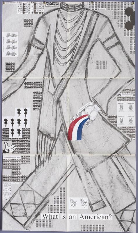 As a Sqelix’u (Salish) member of the Confederated Salish and Kootenai Nation in Montana, Jaune Quick-to-See Smith devotes much of her work to the position of Native Americans and women in contemporary society, and What is an American? is certainly no exception.
