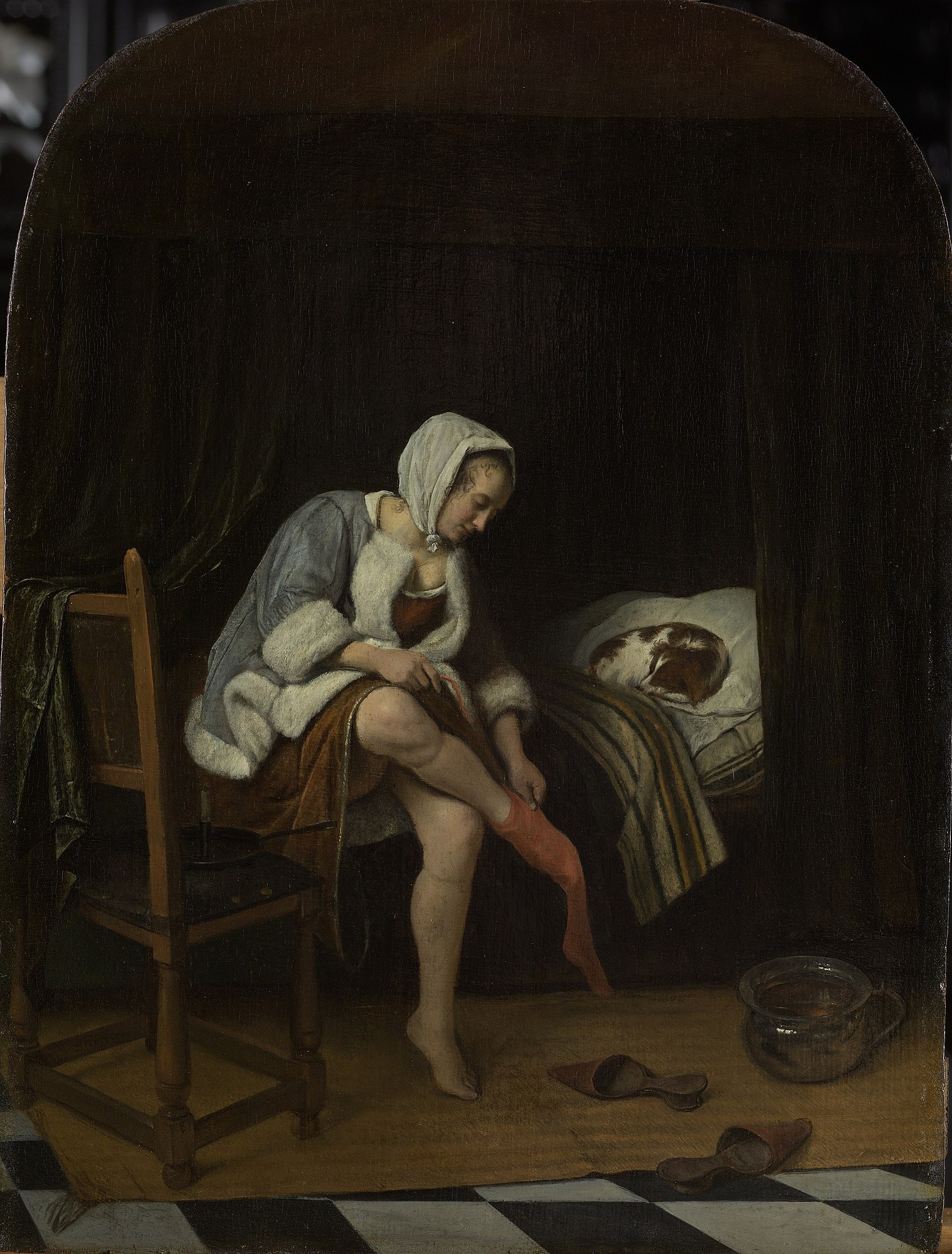 This Jan Steen painting probably has a lot to do with the male gaze, but all I can think is "Damn, those socks must’ve been tight."