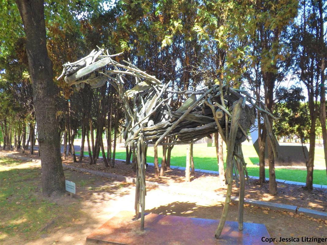 Woodrow was originally “drawn” by Deborah Butterfield with sticks and pieces of wood. Butterfield likens this process of building her sculptural horses with training, or breaking in, her real horses in Montana since she must tame the wilderness to create both. Once this drawing, or building, of Woodrow was completed, Butterfield cast each individual piece of wood in bronze, melting away the wood to finish “taming” her horse. The disparate pieces are then reassembled and welded together to create Woodrow. Butterfield uses her own patina to create the illusion that each element is an actual piece of wood, which of course its ancestor was. Woodrow’s “wood” structure is so realistic that many visitors to the Minneapolis Sculpture Garden believe he is a stick figure horse, including me for my entire childhood.