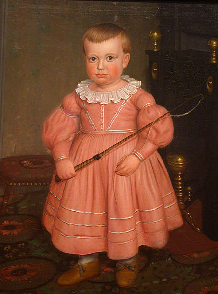 But hey, his ma was probably observing the latest fashion trends in 19th-century children’s wear. The sleeves got some puff, the neckline’s fringed with ruff – this kid is a diminutive dandy! Pink was also the customary color for little boys at the time. It was a watered down version of red, which was the color of soldiers uniforms in many a country. So, fittingly, little boys were dressed in a mixture of red and white, aka power plus purity. Weird.