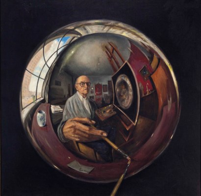 If Salvator Mundi caught your eye, because of the painted presence of a crystal orb, Robert Montenegro proudly displays his artistic talents in this self-portrait. Sure, someone from the Renaissance (maybe da Vinci?) painted the blurriness that occurs when looking through a glass ball, but Montenegro’s work, try to follow along, is a painting of himself painting his curved reflection on a metal ball, which is the painting itself.