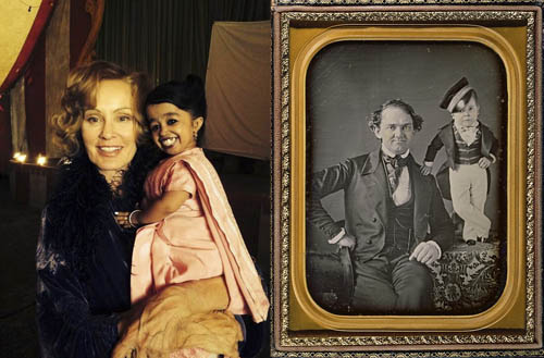 Jessica Lange with Jyoti Amge as Ma Petite (left) and P.T. Barnum and General Tom Thumb by Marcus Aurelias Root at the National Portrait Gallery (right)