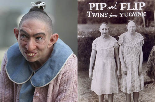 Naomi Grossman as Pepper (left) and photo of Pip and Flip (right)