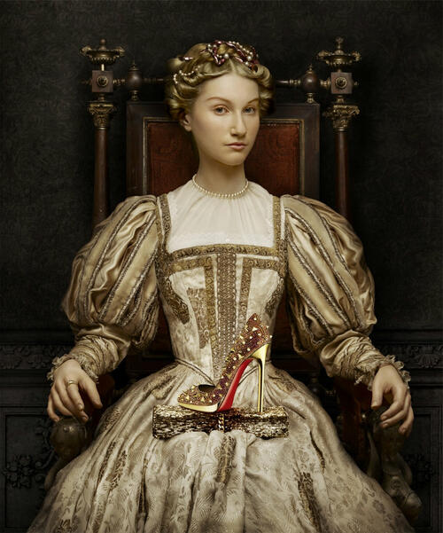 On the other hand, the shoe is everything in the recreation of Elisabeth of Austria, Queen of France by Francois Clouet. In the original, you see only the queen's bust in a dress overflowing with gaudy embellishments. In the Louboutin version, the dress is nice, but not so noticeable, because all you're looking at is the shoe on the contemporary queen's lap.