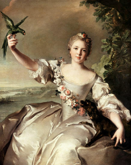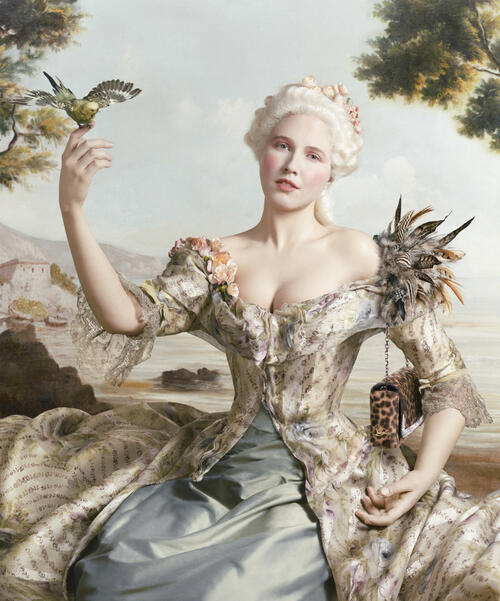 In the Marquise D’Antin image by Jean-Marc Nattier, a vicious looking bird seems poised to fight with a feisty little lap dog. Who needs all of that interspecies drama? Louboutin and Lippman ditched the dog, replaced it with a purse, and the bird seems infinitely happier.