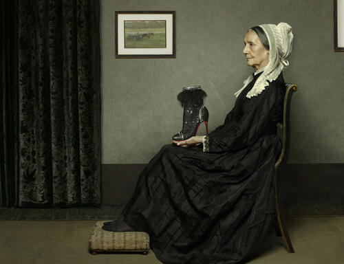 Nobody's ever accused James Abbott McNeill Whistler of making his mother look sexy. In Arrangement in Grey and Black No. 1 she mostly looks tired. But this isn't Louboutin's mother so there's nothing wrong with him taking a look at this older lady and seeing the potential for sex appeal. She have her feet up for a rest but only because she's been dancing in those fringed, heeled, red-bottomed booties all night long.