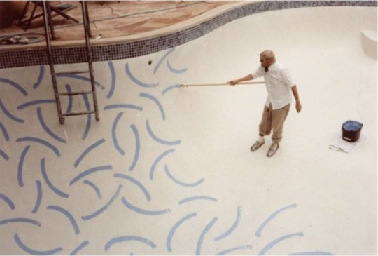 Hockney doesn’t just make paintings of California pools, he paints them too! Here he is painting a mural for the Roosevelt Hotel in Hollywood.