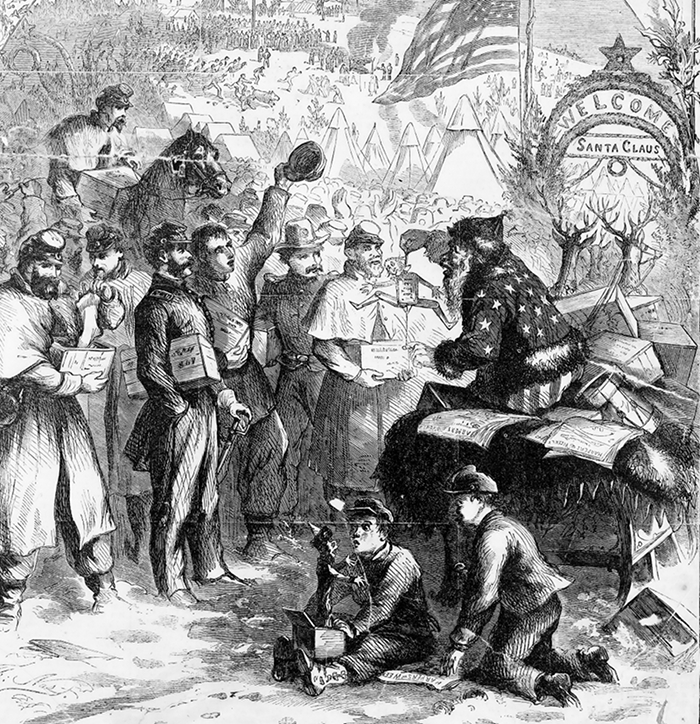 This was his first attempt at Santa Claus, and it was decidedly political. Santa Claus arrives on a Christmas furlough rather than Christmas eve, and his coat is spangled with stars and stripes. It continues the tradition of the reindeer driven sleigh, and may be the first to show his sleigh overstuffed with toys. Twenty years later, in 1882, Nast would draw the first image to be considered a definitive portrait of Santa.