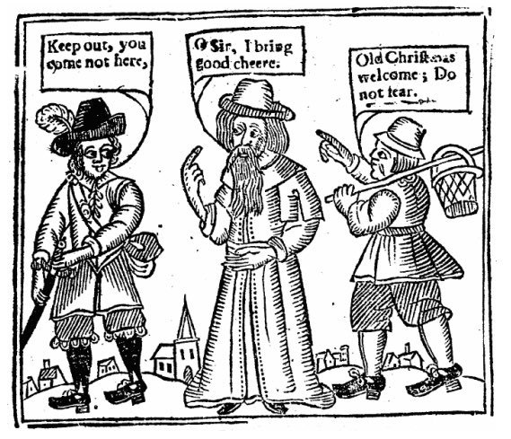 The visual history of Santa Claus may begin in 17th century England where there was a cultural battle over Christmas. The Puritans, a protestant group who wanted to cleanse Christianity of its Catholic traditions, vehemently opposed the celebration of Christmas, a ceremony they found pagan and ungodly. As a response, English writers personified the holiday for the first time as Father Christmas and put the character into plays where ol’ Father Christmas had to defend himself in front of a court. No, really. The illustrators for these books decided to make him lithe and saintly, quite like depictions of St. Nicholas, although the holiday had not yet subsumed the saint into its own celebrations.