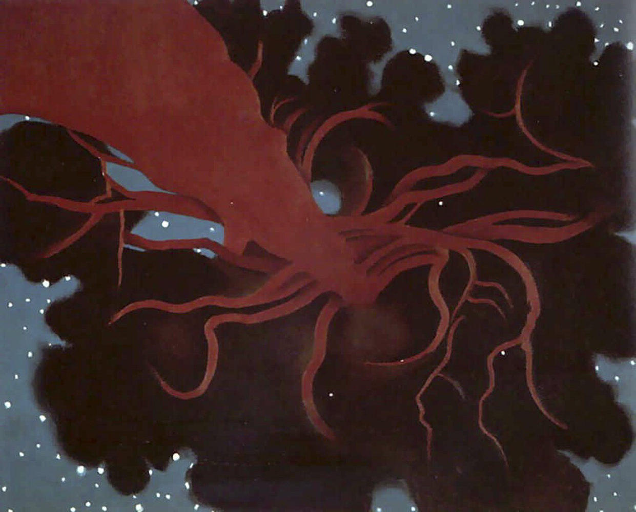 In another example of modern artists reversing perspective on the traditions of tree symbolism, Georgia O’Keefe adopted a new angle of vision in The Lawrence Tree, her striking painting of a ponderosa pine at the house of D.H. Lawrence. She has us look up into the branches that look startlingly like roots, so that the tree seems upside down, except we find orientation in the starry sky beyond it.