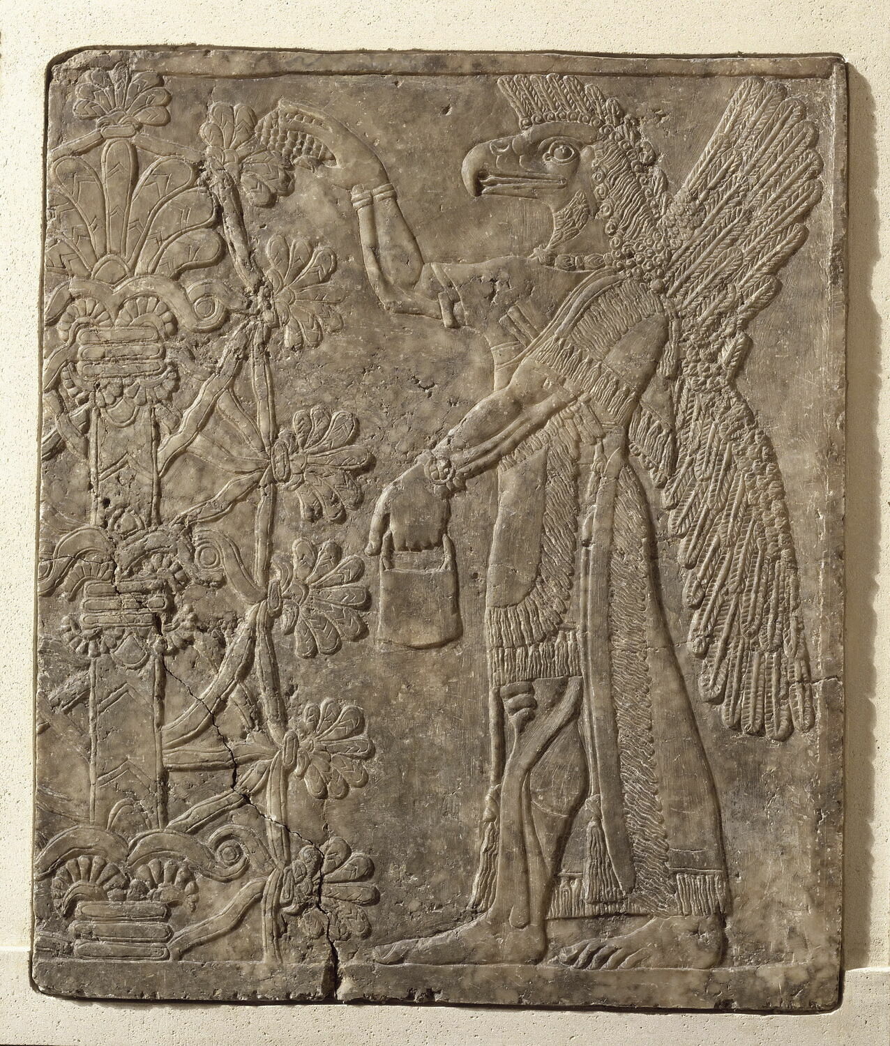 Among the Assyrians, as in this carving from the 8th C. BCE (at the site of Nimrod / Kalkhu, now in the Iraq), the Egyptian myth fostered the image of the Tree of Life. Here the tree is a cedar, visited by winged spirit, who picks the cone from the tree.