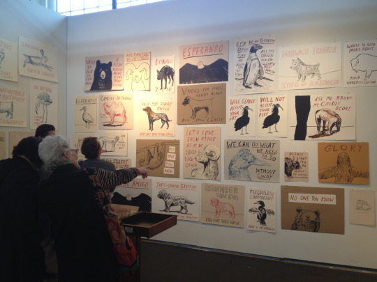 There were probably 20 other people crowded into the gallery space, in various states of hysterics over the hilarious captions of his paintings.