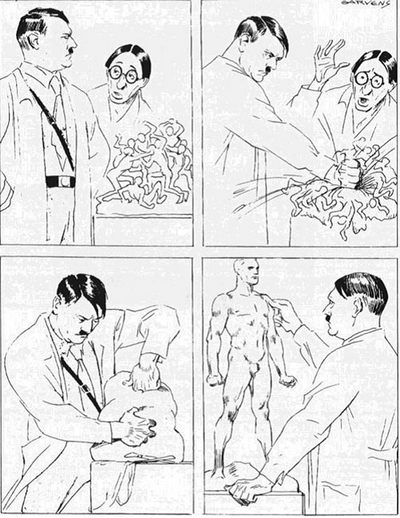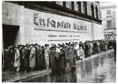 When Adolf Hitler seized control of Germany, one of his first priorities was to ‘cleanse German culture.’ This involved explaining to the German people why certain art is degenerate, and then methodically getting rid of that art. In Hitler’s mind, modern art, and all art made by artists of non-Aryan blood, was degenerate. To make sure people knew where the line was, he ordered up a special exhibition creatively entitled “Austellung Entartete Kunst“ (Show of Degenerate Art). In it, paintings were poorly lit, hung in a haphazard fashion, and interspersed with Nazi slogans slamming the art.