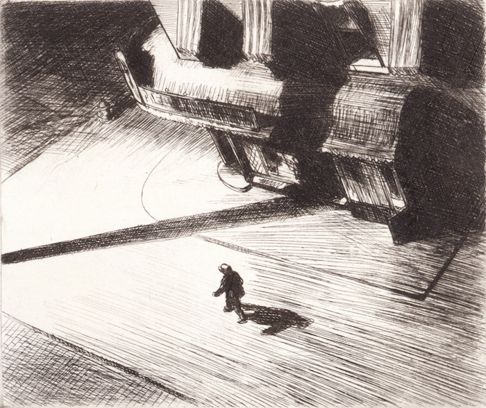 In the basement, there were a bunch of other works that fit the theme of “shifting perspectives,” including a lovely Edward Hopper sketch of (what else?) a lonely city corner at night.
