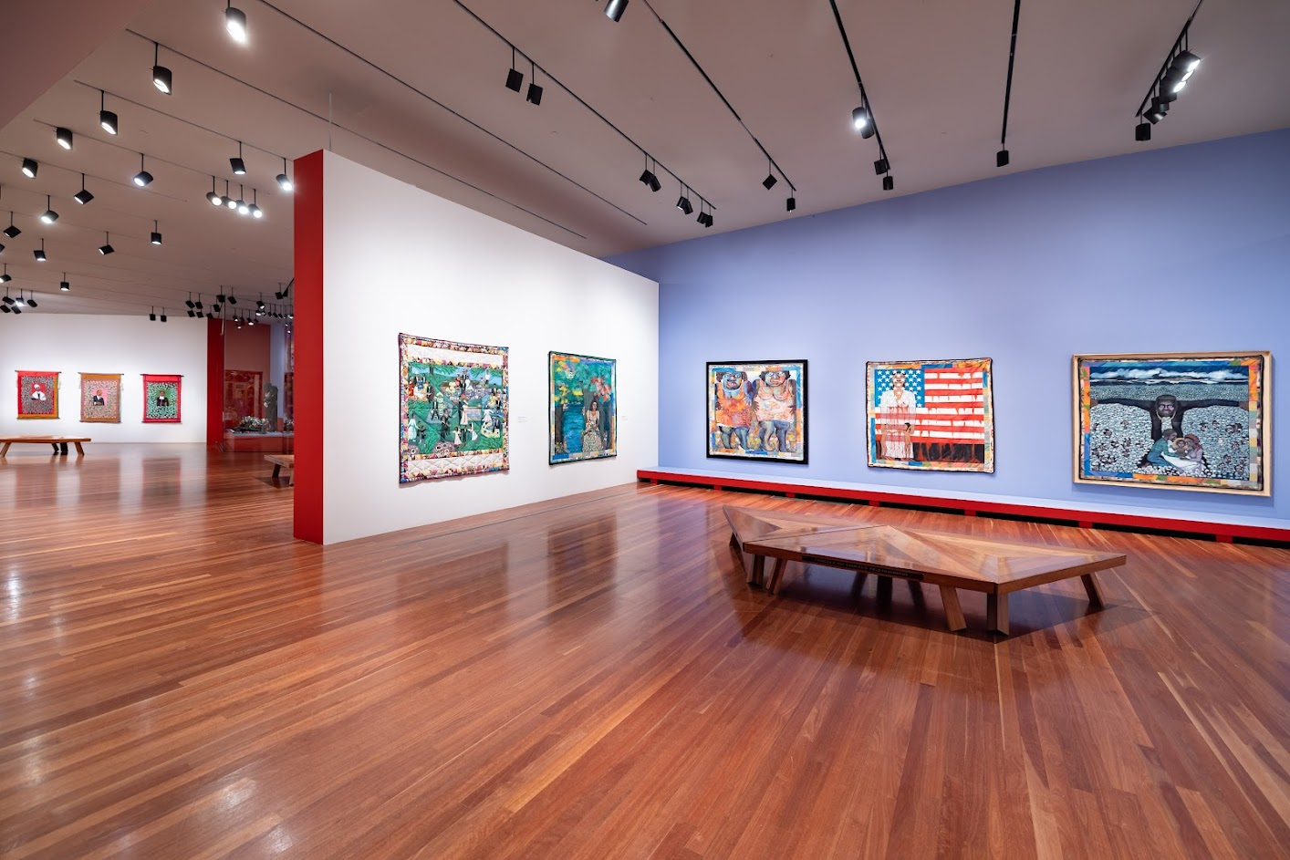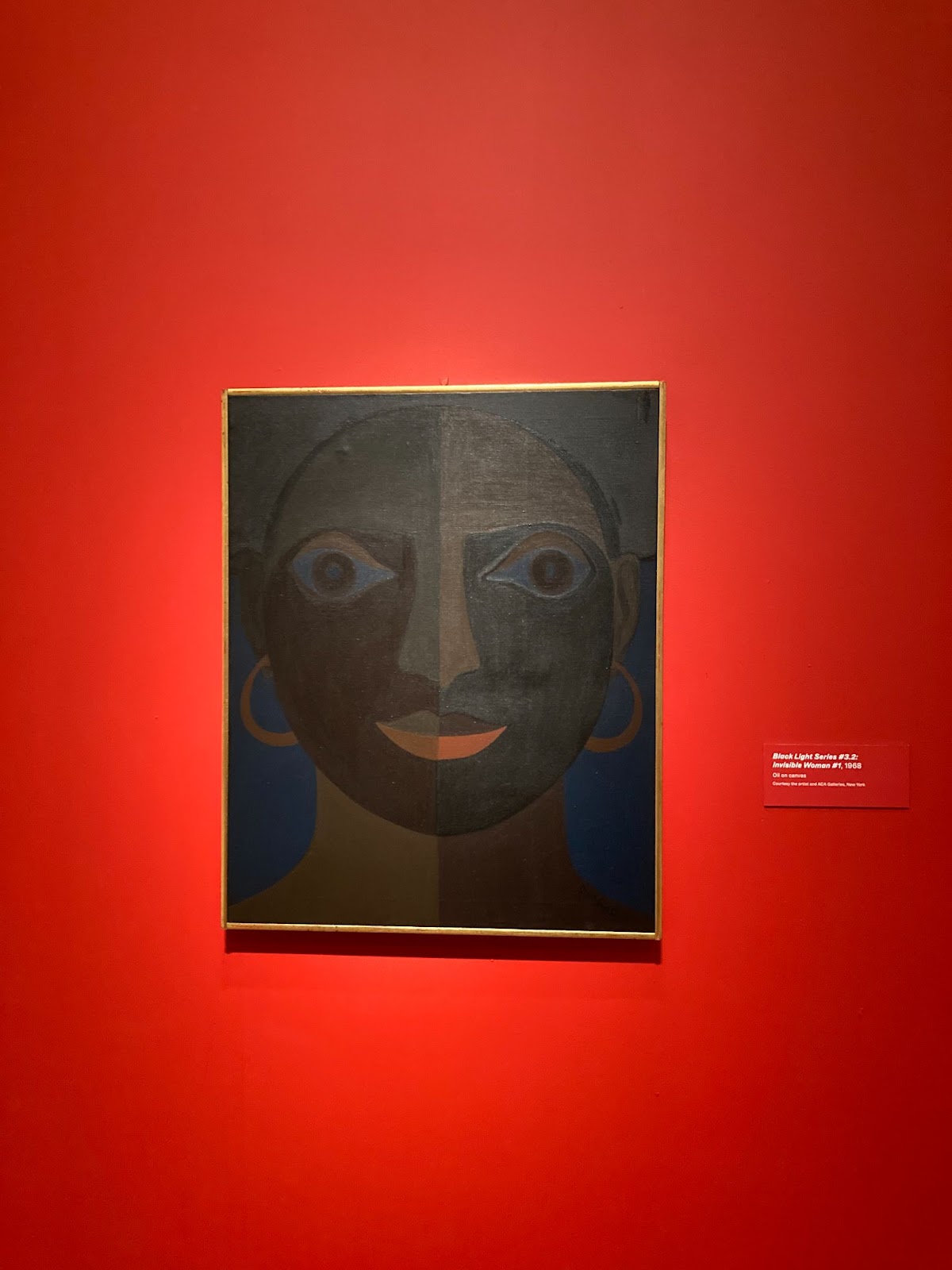 To ensure that two of the pieces, Black Light #3.1 Invisible Woman and Black Light #3.2: Invisible Man, are properly showcased, they’ve have been mounted on brightly colored walls, as Ringgold felt some of their nuance was lost when displayed against a white background. Both of the chosen colors also carry a meaning. The red is meant to be reminiscent of the American flag, a symbol Ringgold utilized across several of her paintings. The lilac is an homage to her Tar Beach story quilt and children’s book.
