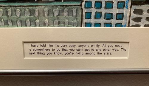 Tar Beach is a lighthearted and very fun example. The book’s star, Cassie Louise Lightfoot, learns she can fly, and anything she flies over is hers to claim. Every page of the book is on display, as well as the story quilt that inspired it. I highly recommend spending a couple minutes to read the full story, it’s enjoyable and adorably sweet.