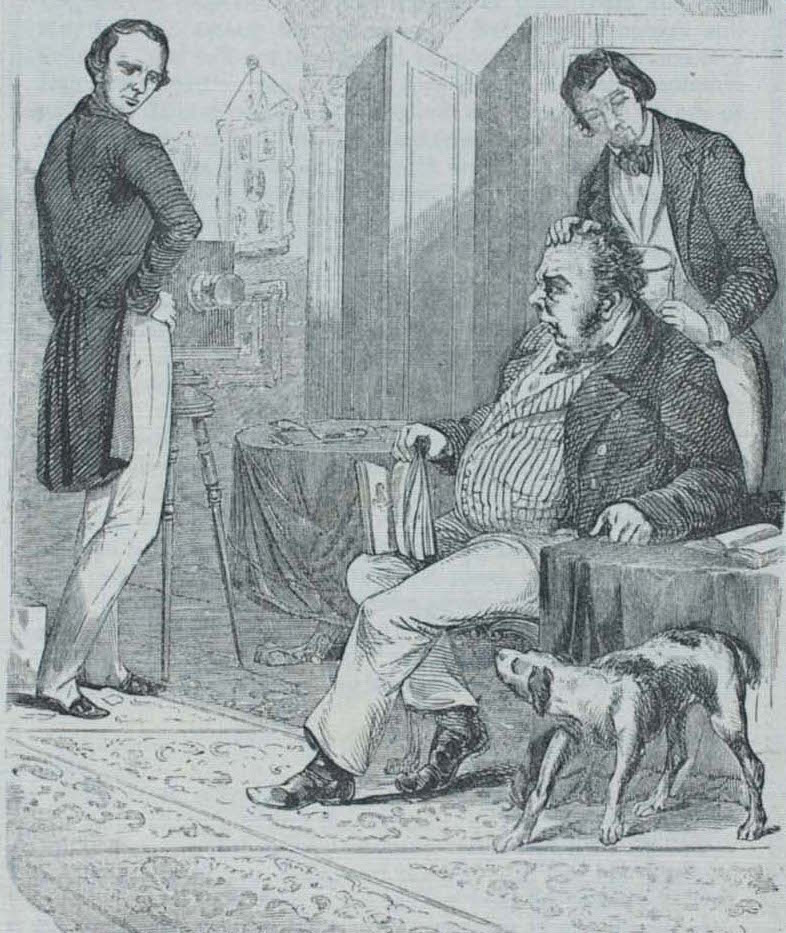 19th-century etching of Marcus Aurelius Root photographing a client.