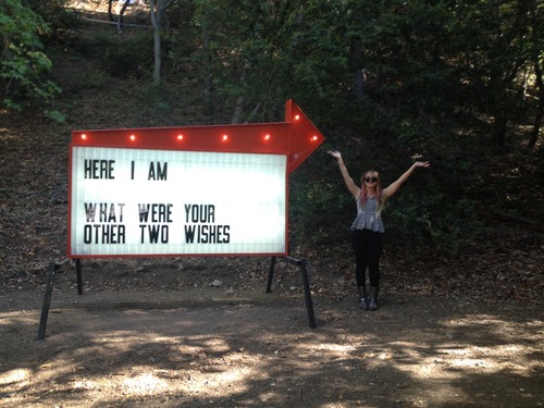 Across the way we encounter our first installation, a huge, retro billboard sign with a flashing red arrow; an untitled work by Allison Wiese. The text reads, “HERE I AM. WHAT WERE YOUR OTHER TWO WISHES?” I’m thinking of getting it on a bumper sticker. We giggle and hop out for a photo op, because if you don’t Instagram it, did it really happen?