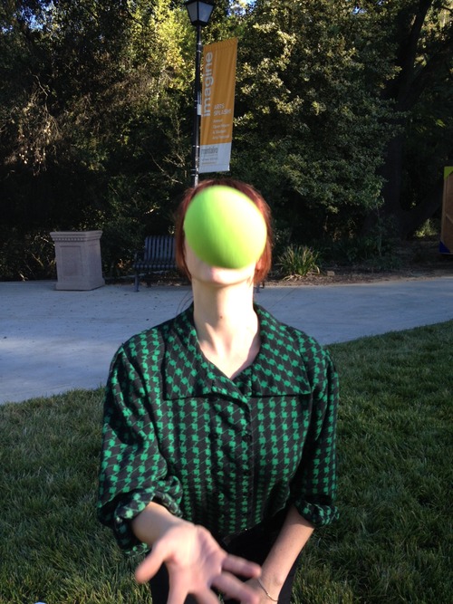 Bonus points that the lime green ball makes me look like René Magritte’s painting The Son of Man, of Thomas Crown Affair fame.