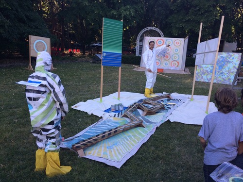 Looking gleefully like Mike Teevee from the original Willy Wonka and the Chocolate Factory, artist Michael Hall explained to participants how to run through his painting obstacle course. When one of the adults questioned if a particular wall-climbing structure could support his weight, Michael assured him enthusiastically, “I’ve jumped over that thing tons of times!“