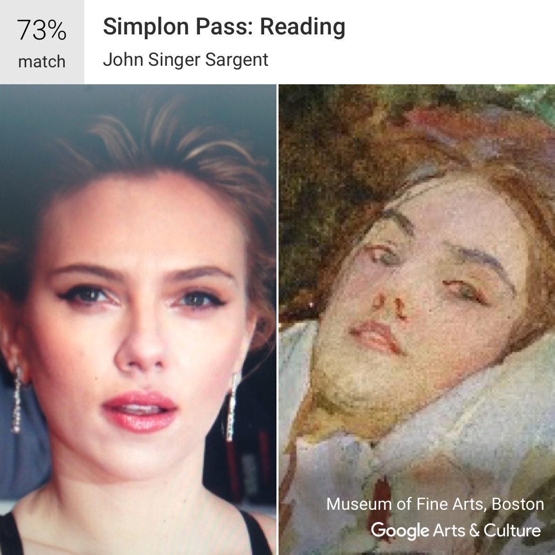 Hoping to find Scarlett match with the Girl with a Pearl Earring, she was the first on the list. But alas, John Singer Sargent’s reclining lady from Simplon Pass: Reading appeared as a better match. Scarlett matched with Sargent’s niece, Rose-Marie who was a favorite model of Sargent’s featured in this watercolor. The reason she didn’t match with Vermeer’s painting could be because it’s housed at the Mauritshuis which isn’t in the Google Arts & Culture database yet.