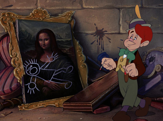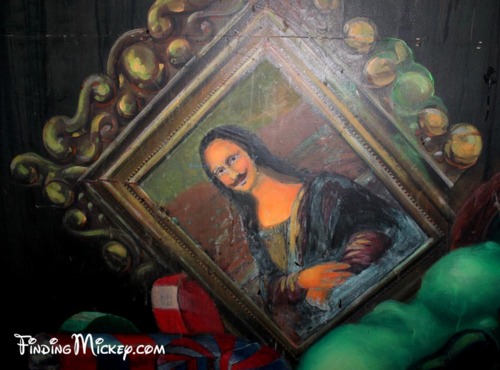 Check out the Mona Lisa on the evil Coachman’s Pleasure Island … except, what’s this? The one on the ride has been defaced with a mustache! Was Marcel Duchamp here?