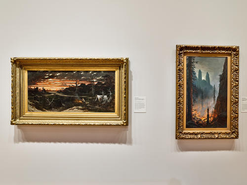 The exhibit continues through a display of Tavernier's landscapes, particularly some stunning vertical pieces showcasing the Redwood trees of the Bay Area. One exceptional work in the exhibit is a pastel piece, here on loan, titled Yosemite (Forest Fire in Moonlit Landscape). Tavernier does an astounding job playing with the detail of light in all of his work. It’s a hard thing to capture in pastels, but he was a master of the medium. He arguably introduced “the pastel craze” to San Francisco artists in his time. As we mentioned in our review of the pastel art exhibit at Legion of Honor, it’s difficult to preserve pastel art, so it is often not on display in order to protect it, making this a special piece to get a chance to see in person.