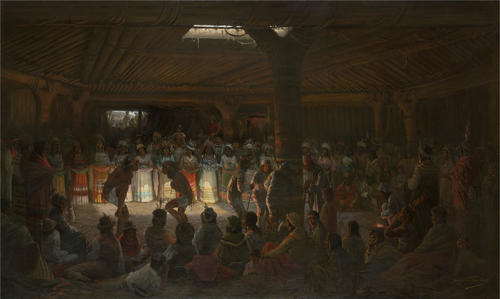 Speaking about the painting, Robert Geary shares that it could be his three-times great grandfather depicted in the image, and that overall, the work makes him happy. It depicts his culture's history - the baskets that they used, their ceremonial dress, the power of the generational knowledge that comes together in such a ceremony. And he says that, ultimately, he believes that the ceremony depicted worked, because he and his children are still here today. They still make baskets and perform ceremonial dances.