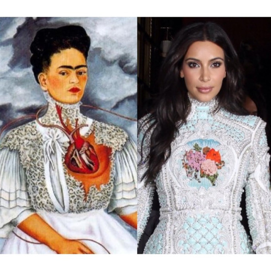 Image by Art-Lexa Chung via Dazed Digital: The Two Fridas (Las Dos Fridas) by Frida Kahlo (1939) at MOMA Mexico / Kim in a Balmain dress for her bachelorette party in Paris (Getty Images)