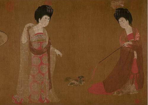 Zhou Fang (730-800) worked as a court painter during the Tang dynasty and is most notable for his silk paintings of elegant court ladies. Adhering to strict ideals of court behavior, the beautiful women drift through stately gardens, graceful and yet seemingly marked by ennui and loneliness. The only relief seems to come from playing with the little companion puppy scampering about by their feet with a feather duster. Indeed, whenever the pup is present in a painting, all eyes are directed toward him, and the women’s faces bear the trace of a smile. Who’s surprised? Not me! Dogs make everything better. In Imperial China this kind of lapdog was primarily an indicator of high social status, not just a source of emotional support, but dogs were also kept around the home because they symbolized familial harmony and procreation. According to one Chinese myth, after humankind was first created by the original humans, Nŭwā and Fúxī, the next animal they created was the dog. If you ask me, they clearly had their priorities in order.