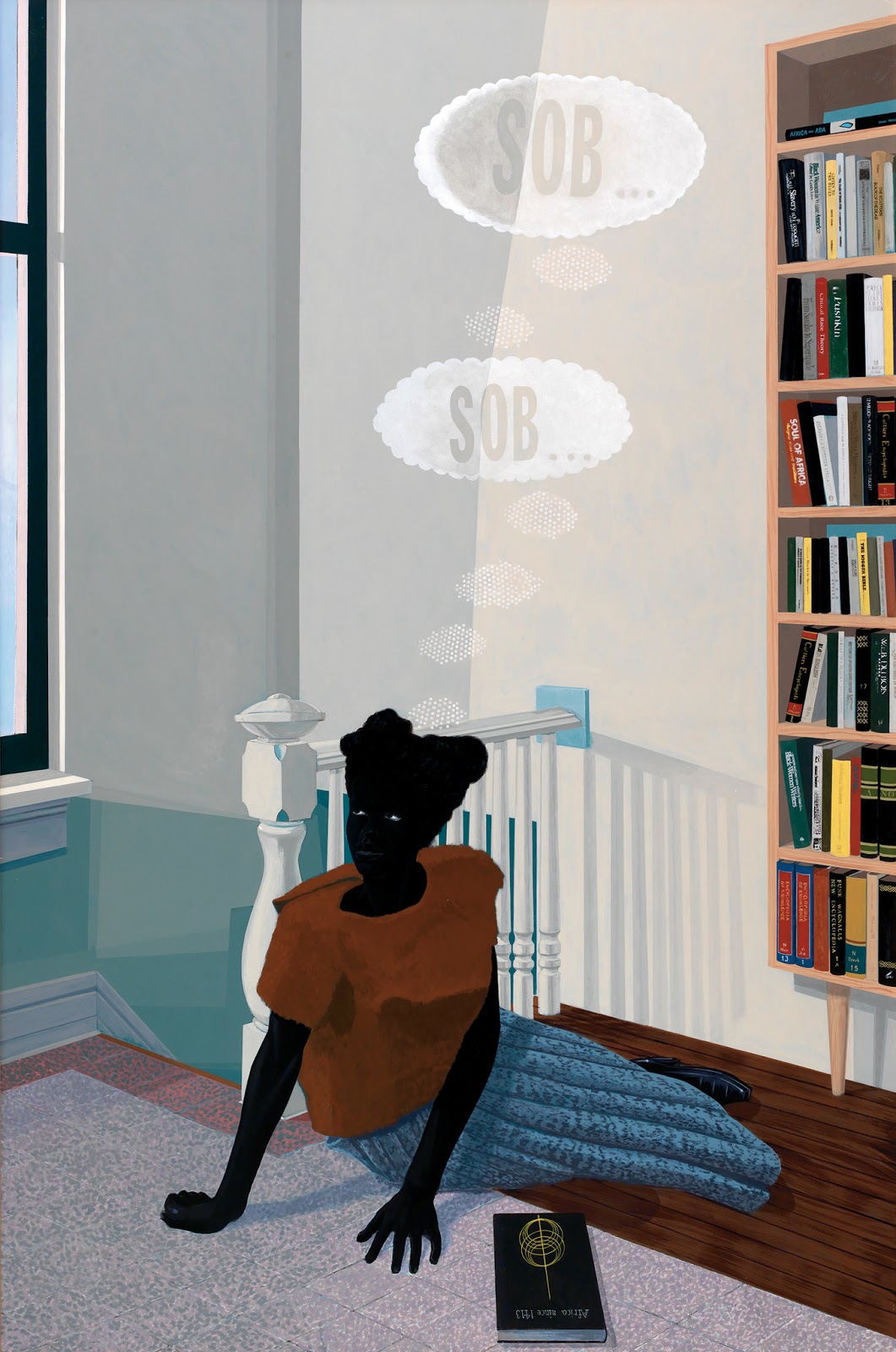 As MLK notes just how deeply structural racism is rooted in America, Kerry James Marshall illustrates the importance of educating oneself of this violent history within the fight for liberation. Accompanying the book Africa since 1413 that sits in front of the female protagonist of the painting, is an entire bookshelf filled with similar volumes on critical racial theory and postcolonial theory, including the following titles: Africa -- Asia, From Slavery to Freedom, Black Women in White America, Listen to the Blues, The Egyptian Book of the Dead, From Sambo to Superspade, Critical Race Theory, Soul of Africa, Black Women Writers, Encyclopedia of Knowledge, and a title by W. E. B. Du Bois.
