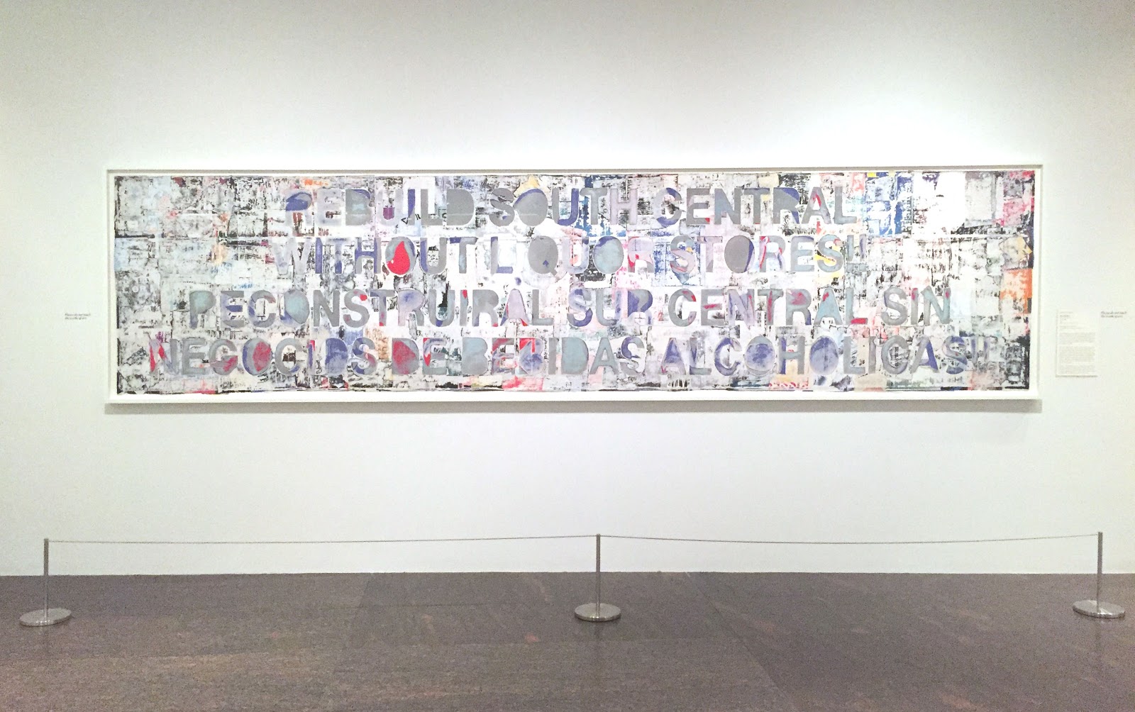Mark Bradford reflects on the 1992 Rodney King riots with his piece that reads, “REBUILD SOUTH CENTRAL WITHOUT LIQUOR STORES!! RECONSTRUIRAL SUR CENTRAL SIN NEGOCIOS DE BEBIDAS ALCOHOLICAS!!” The riots that broke out across South Central Los Angeles lasted for five days, resulted in over $1 billion in damages, and the city of Los Angeles declared a state of emergency. Sound familiar? Just like the 2014 Ferguson protests, those not directly impacted by police violence bemoaned the destruction of property and shunned the Black Lives Matter movement for supposedly not following the teachings of MLK. However, MLK would have understood the unrest in South Central and in Ferguson; he lived it in Birmingham and argues that those who emphasize the collateral damages lose sight of and ignore the larger issue of racial injustice.