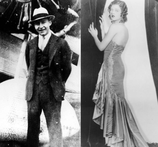 Zachary Reynolds poses in front of his plane, and Libby in her one of her signature strapless gowns (some credit her with inventing the strapless dress).
