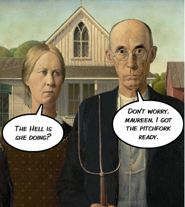 Here is Perry again, in front of Grant Wood’s American Gothic.