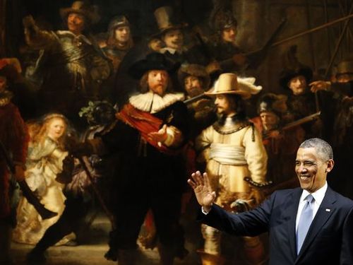 So today in Amsterdam, our Commander-in-Chief threw art lovers another bone by visiting the Rijksmuseum and holding a press conference in front of Rembrandt’s The Night Watch. He even stated, “"I’m proud to be here with some of the Dutch masters I studied in school.” One of us! One of us!