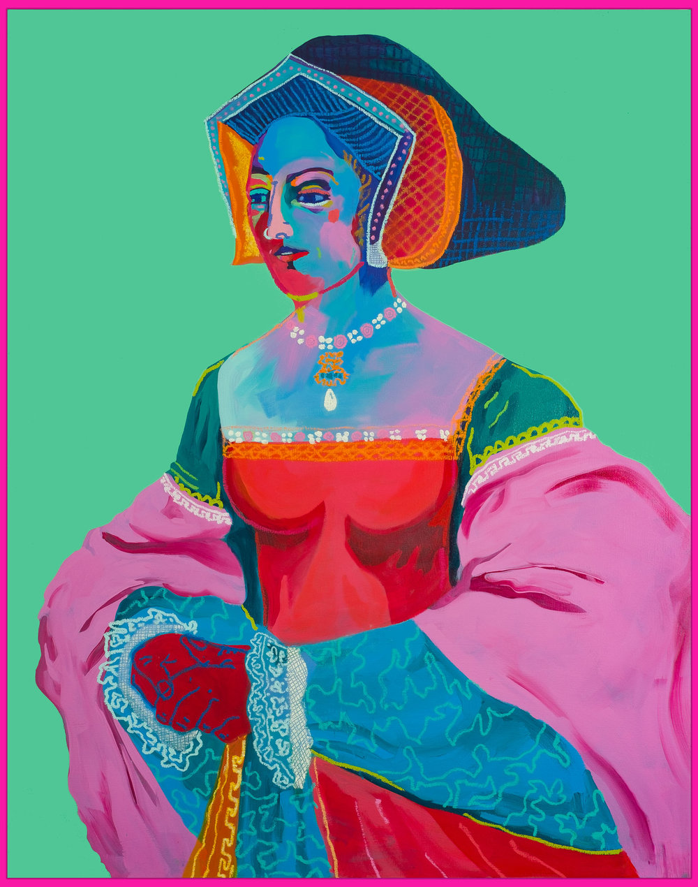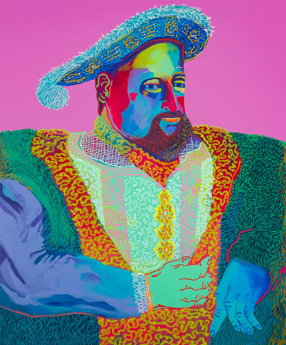 Using daring and only slightly unconventional colors, artist John Holcomb (represented by Rebecca Hossack Gallery) paid homage to Hans Holbein the Younger’s portraits of Henry VIII and Jane Seymour as part of his series “Masters Fan Club.”