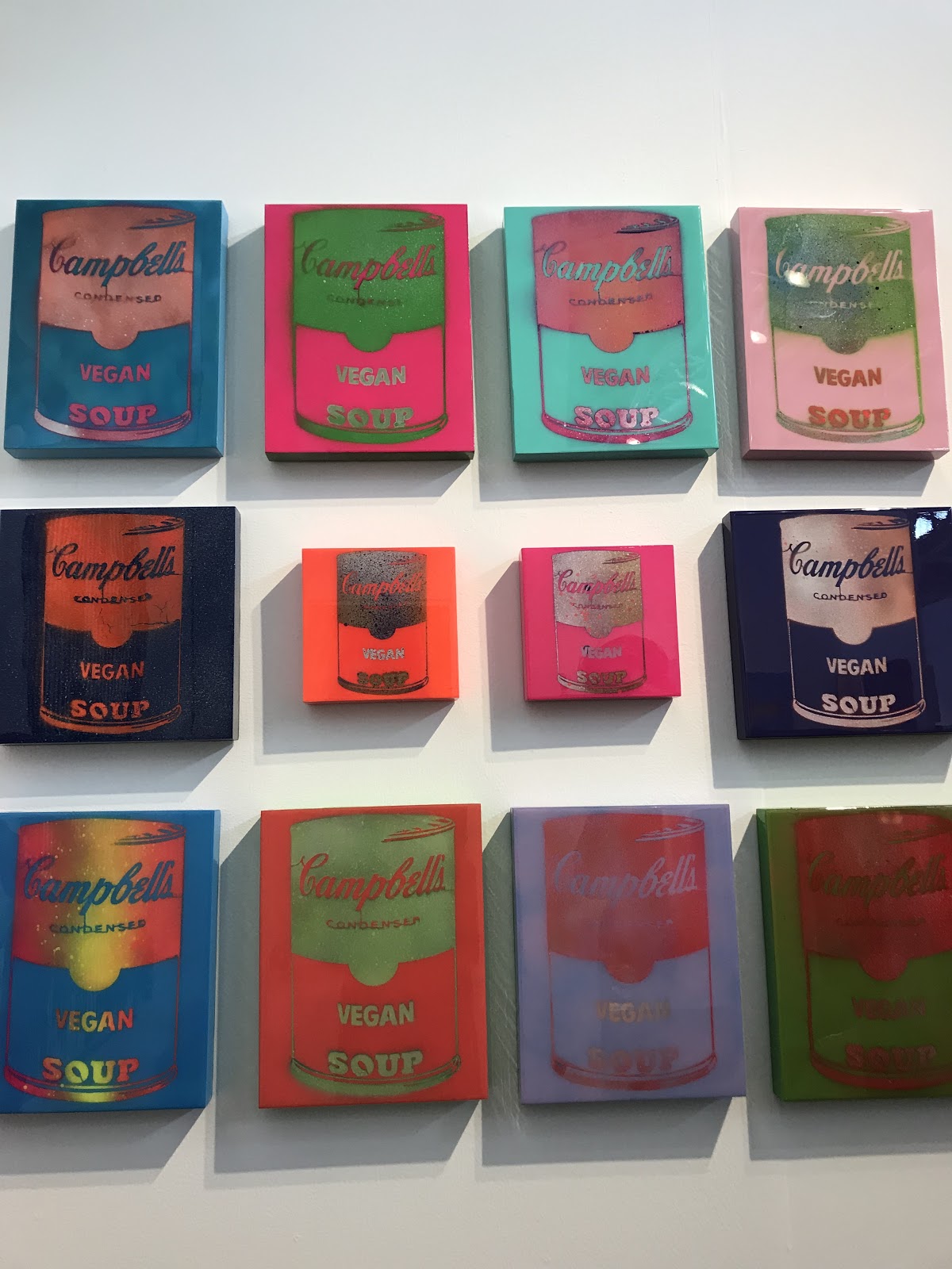 The Arteria Gallery also displayed these vegan editions of Andy Warhol’s famous soup cans painted by French artist L3F0U.
