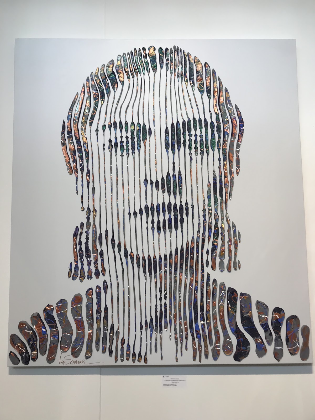Another interesting take on portraiture was Virginie Schroeder’s mixed media portrait of Frida Kahlo, exhibited by the Quebec-based Arteria Gallery. Schroeder applied a mixture of oil and acrylic paint with a syringe that gives this portrait its abstract-from-far-away look.