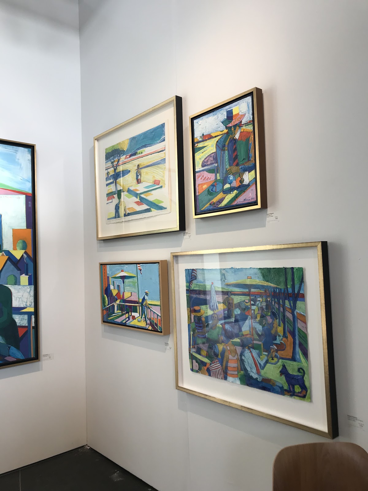 Speaking of art teachers at UC Davis, the Studio Shop Gallery from Burlingame, CA exhibited multiple pieces by painter Roland Petersen. His use of vibrant, exaggerated color is very similar to that of his colleague Wayne Thiebaud. Some of Petersen’s best-known works are those part of his Picnic series depicting the university’ annual Picnic Day event; in fact, UC Davis just held is 104th Picnic Day celebration on April 21, 2018.