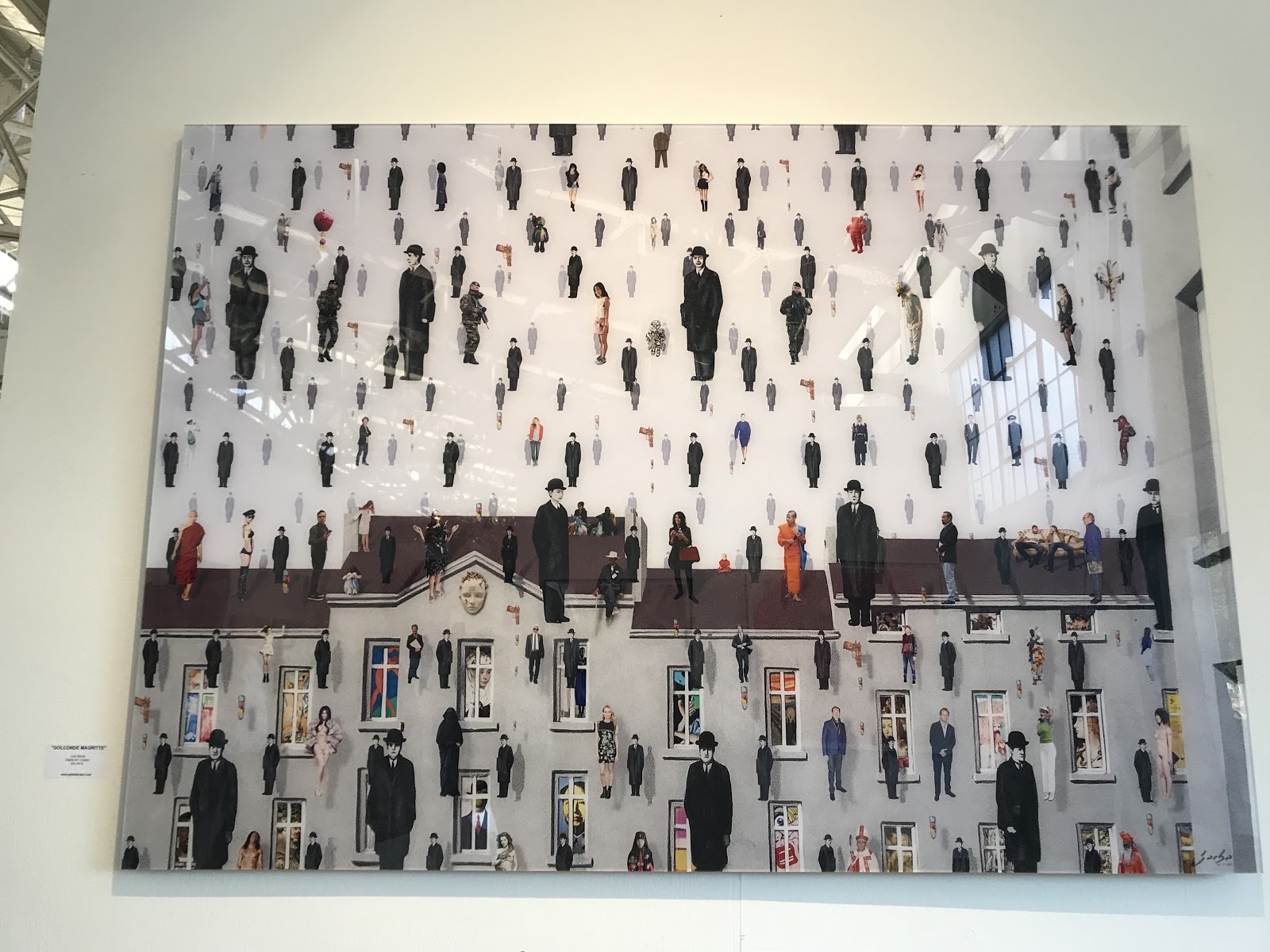 Balba also pays tribute to Rene Magritte in a massive piece Golconde Magritte that reinvents Magritte’s Golconda by inserting contemporary figures alongside Magritte’s signature bowler-hatted men.