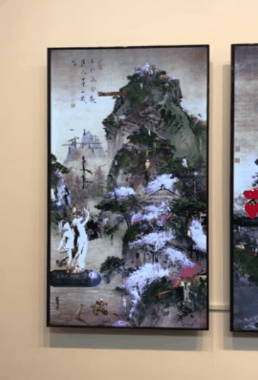 The cartoon folding screen below, created by Korean artist Lee Lee Nam, features traditional watercolor paintings with contemporary images animated over them, including Rodin’s Thinker, Michelangelo’s David, and Bernini’s Apollo and Daphne. Nam’s mixed media artwork often plays with traditional Western masterpieces.