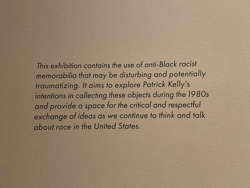 You turn the corner and at first all you see is an amazingly huge room filled with colorful, fashionable mannequins. It’s stunning. Then, as you collect yourself, you get the chance to see that there are different areas to the room. You’ll see a small display of Chanel-inspired tweed suits, for example. On one end of the room is the area that the trigger warning is about. Signage explains how Kelly would collect racist memorabilia and reappropriate it to raise awareness about Black issues and remove its power as anti-Black imagery, incorporating it into his designs and adapted as the brand's logo.