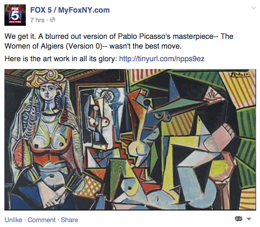 In recent art news, Pablo Picasso’s The Women of Algiers (Version O) recently sold at auction for $179 million (£114 million) at Christie’s New York. A Fox news station (NOT sensationalist media outlet Fox News like some are saying, here’s their actual segment) obviously reported on the crazy amounts of money people are spending on art, unfortunately they decided that abstract cubist nipples were the worst thing in the entire world and needed to be censored.
