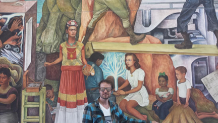 The mural can be hard to find, but there are signs if you pay attention. It’s inside the Diego Rivera Theatre (left) and you’ll turn right at the banner (right)